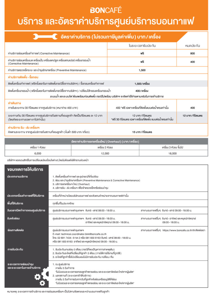 Generally, Boncafe guarantees repairing service only for machines, which are purchased from Boncafe of the brands and models which we officially represent. Boncafe represents the following brands in Thailand: