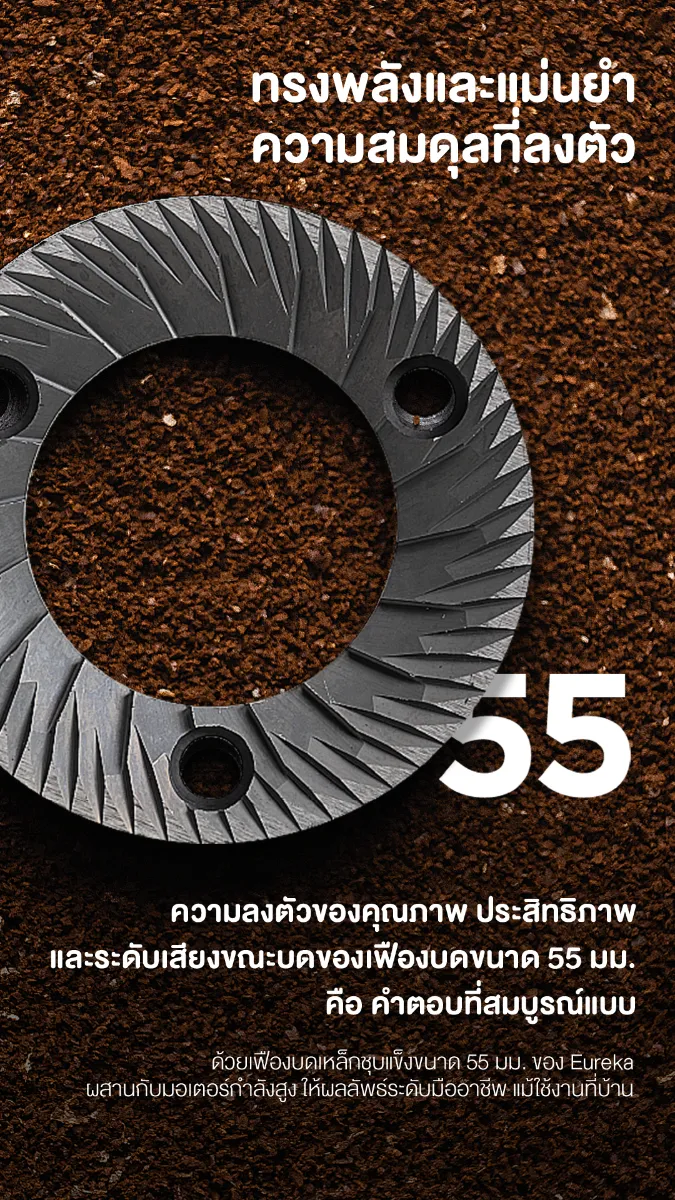 paves the way for a new way of grinding coffee: accurate and quiet. - Stepless micrometric regulation system (patented by Eureka) The micrometric system with infinite adjustment points, the only one based on the lower burr repositioning, guarantees unparalleled grinding performances and allows to carry out maintenance operations without losing the grinding setting.