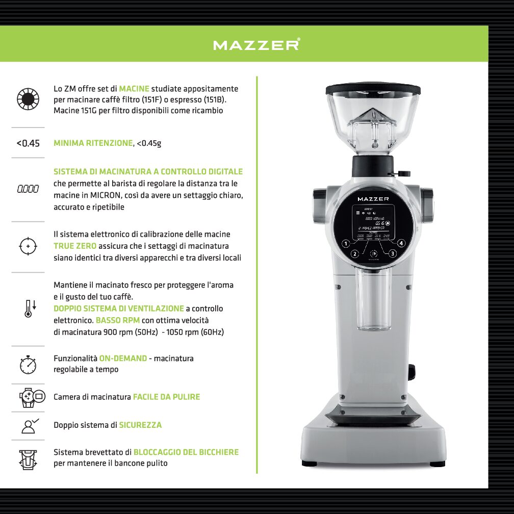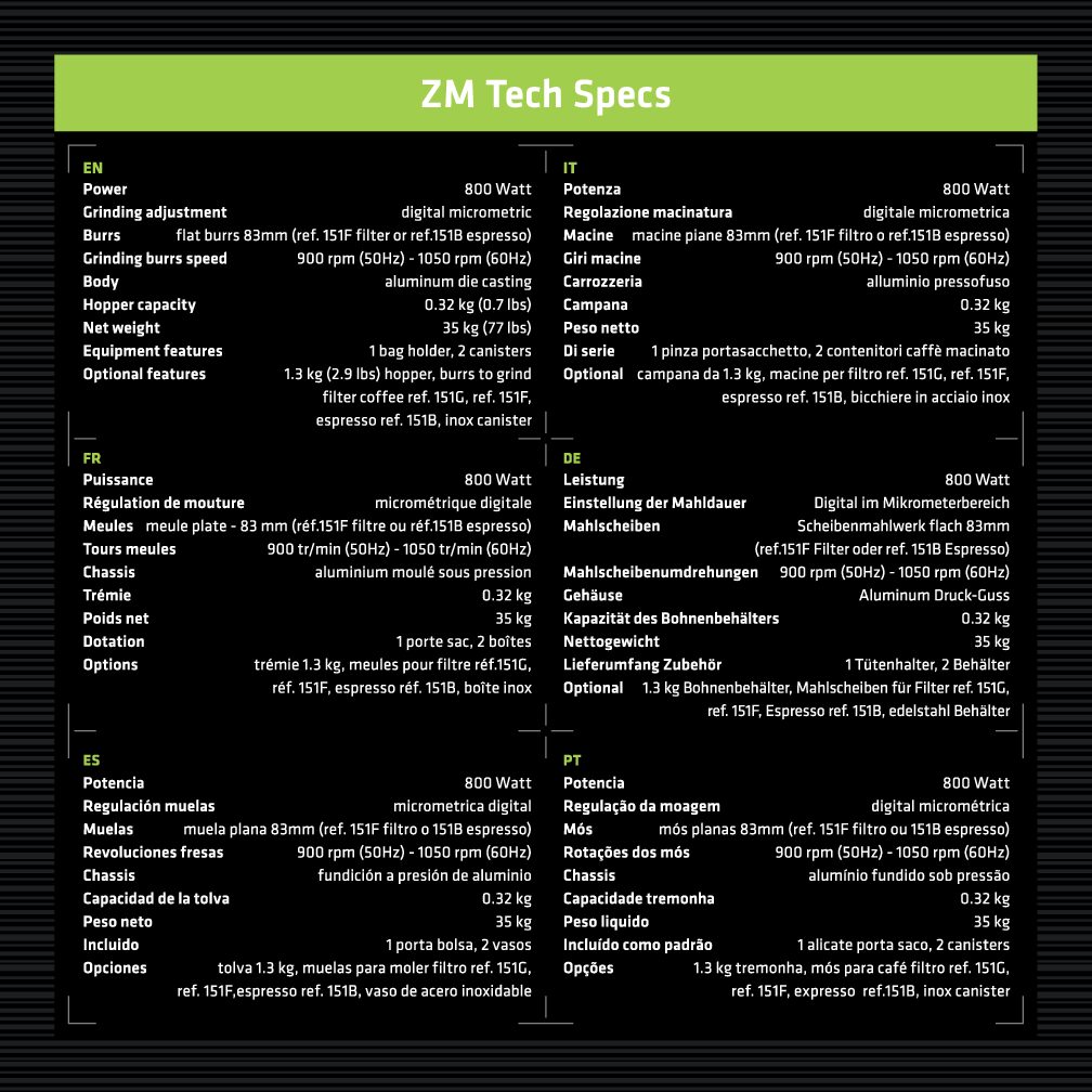 – The ZM features flat burrs specifically designed and tested to grind for filter coffee (151f) or espresso (151b). 151g for filter available as spare part.