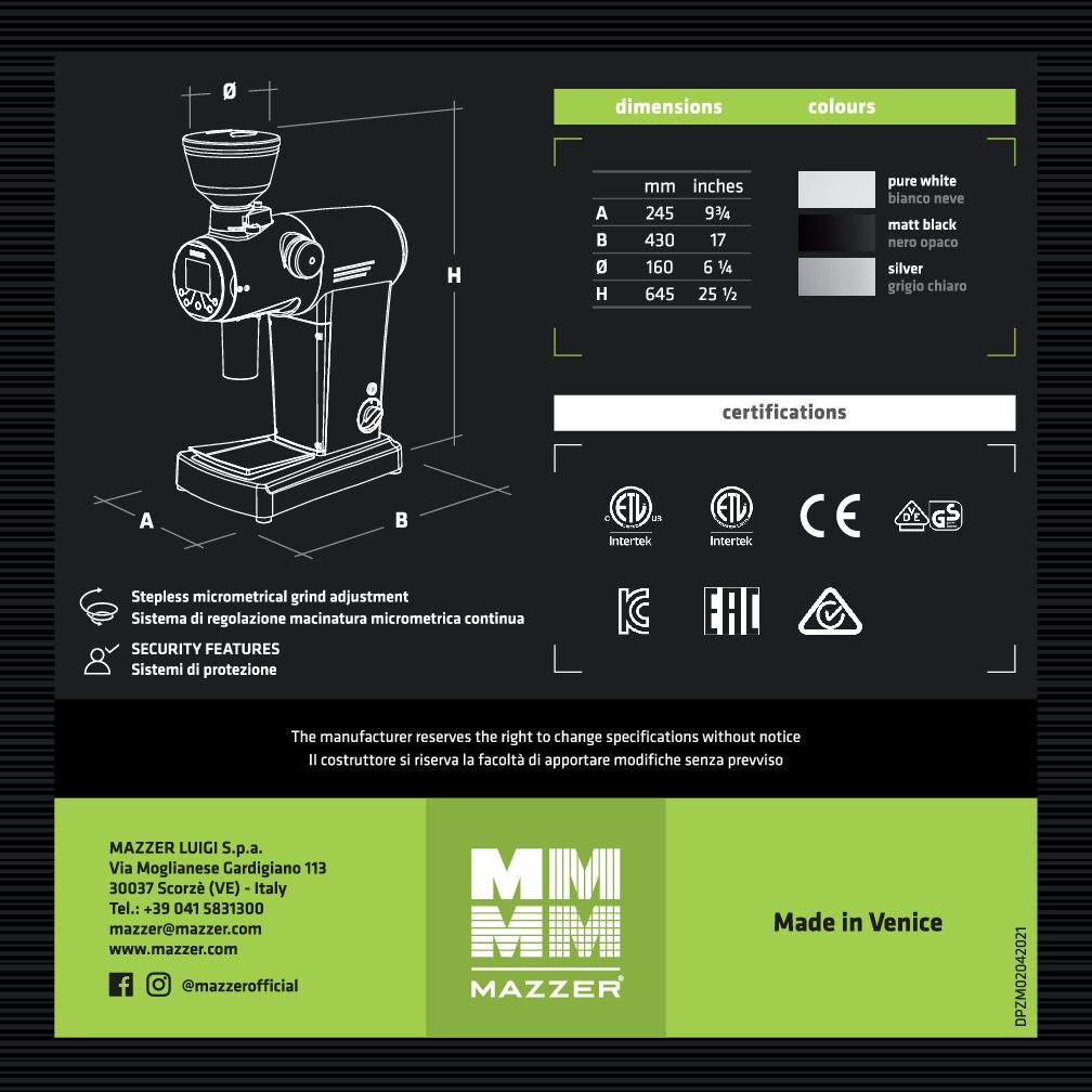 – Electronic true zero calibration ensures that the zm grind settings are identical from grinder to grinder, café to café.
