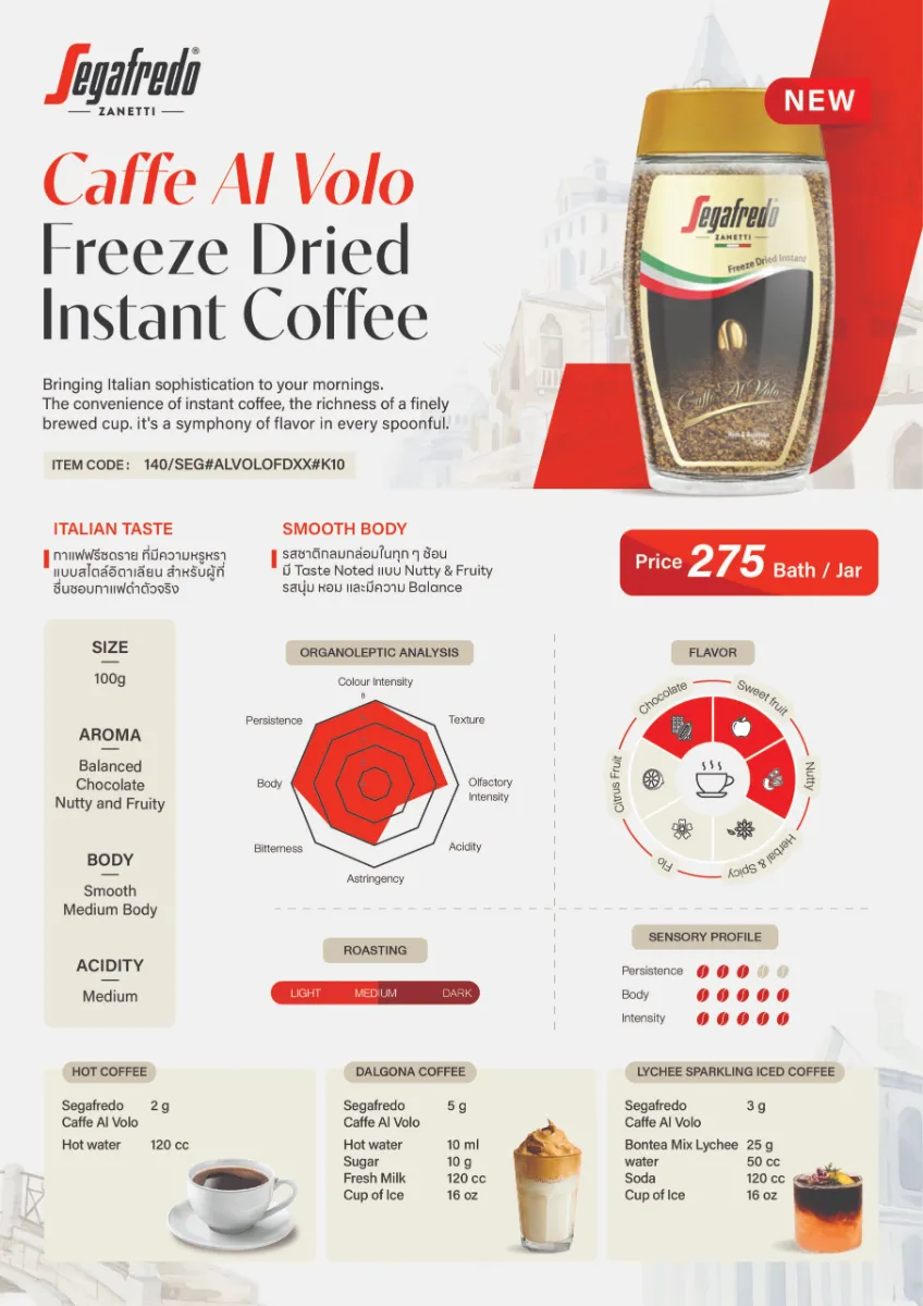 Start every morning with the luxurious taste of Italian-style coffee. Segafredo Caffè Al Volo is crafted from carefully selected Arabica and Robusta beans, freeze-dried to preserve their authentic aroma and flavor. This instant coffee delivers the perfect balance of smoothness and richness — a well-rounded taste with nutty and fruity notes, medium body, and a mellow finish. Ideal for coffee lovers who value both quality and convenience, it’s designed to suit modern lifestyles and busy mornings, offering a quick and satisfying coffee experience anytime, anywhere.