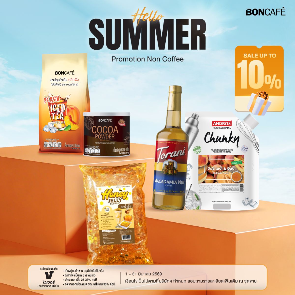 ลดท้าลมร้อนสูงสุดถึง 10%!! ด้วยโปรโมชั่นสินค้าหมวด “Non Coffee” หลากหลายแบรนด์ ไม่ว่าจะเป็น Andros, Cocoa Powder, Bontea Mix, Fora Bee, Torani มาเติมความหวานให้ฉ่ำหัวใจ ในซัมเมอร์นี้