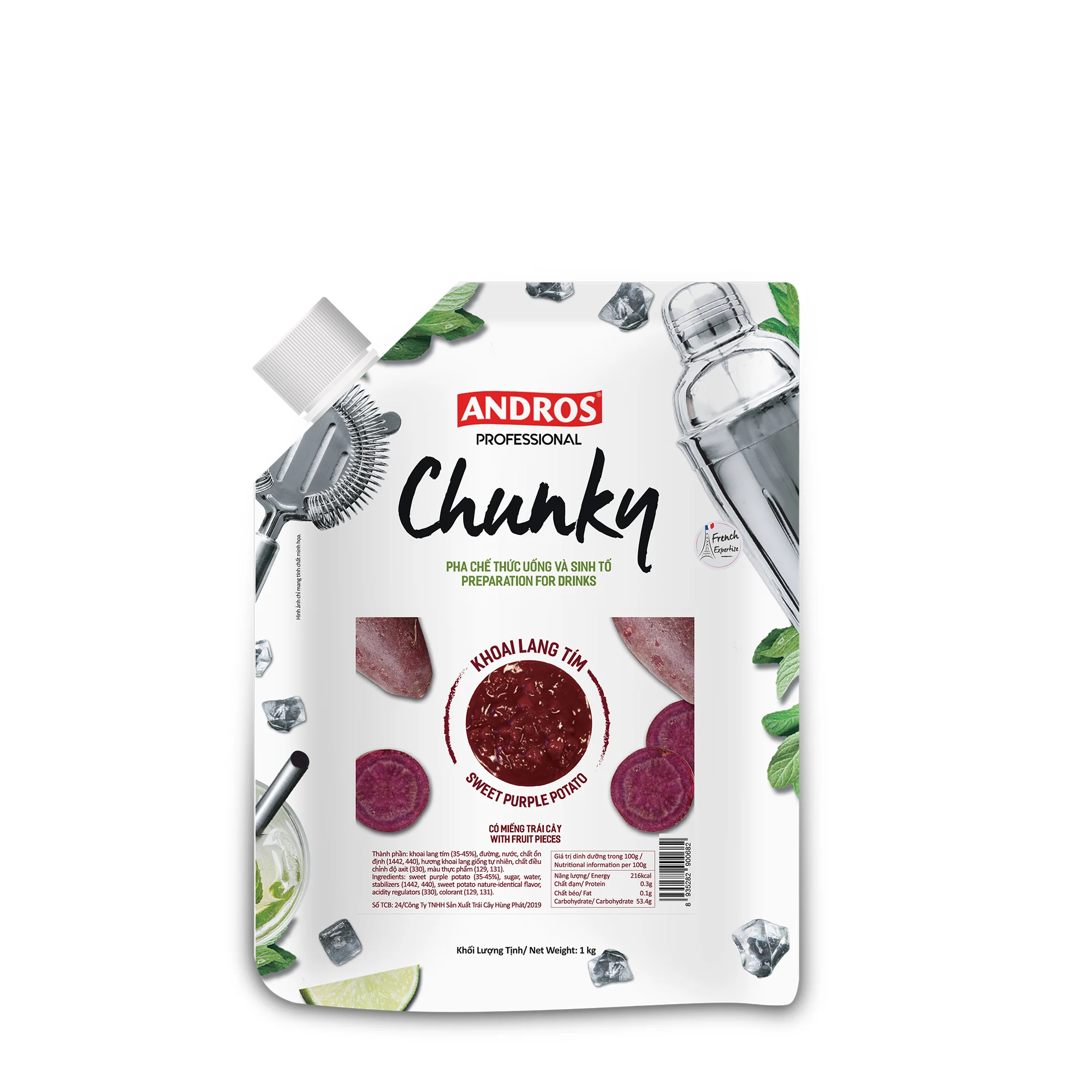 Andros Fruit Chunky รส Purple Sweet Potato รสชาติหวานมัน มีกลิ่นหอม พร้อมชิ้นมันม่วงเนื้อหนุบหนับเหมาะสําหรับนํามาทําได้ทั้งเครื่องดื่มร้อนและเย็น ไม่ว่าจะเป็นนมมันม่วง, ชานมมันม่วง, นําไปปั่นเป็นสมูทตี้ หรือใช้ท็อปปิ้งขนมต่างๆ ได้อีกด้วย