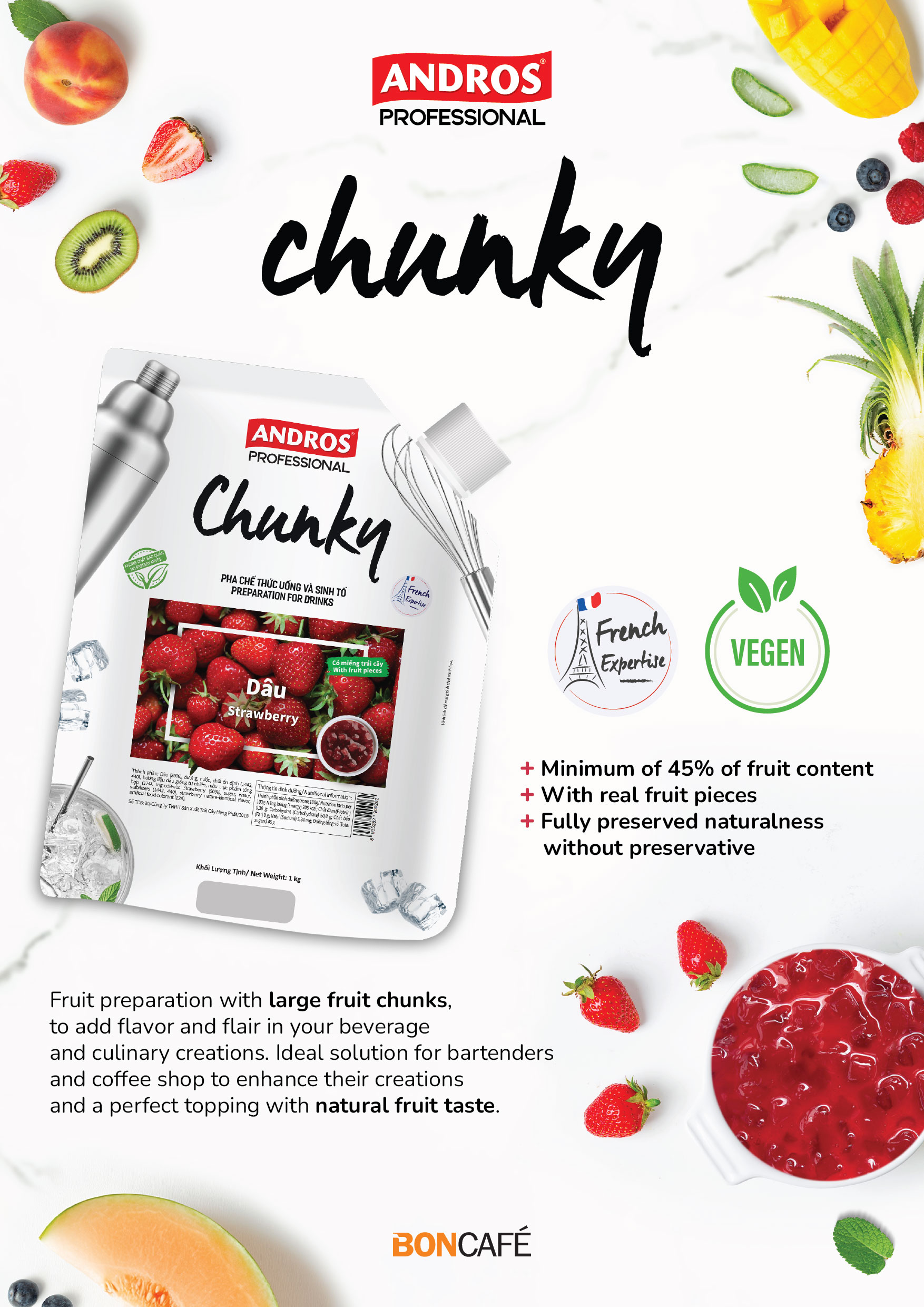 เนื้อผลไม้เข้มข้น แอนดรอส ฟรุ๊ต ชังกี้ ว่านหางจระเข้ผสมลิ้นจี่ ผลิตภัณฑ์เนื้อผลไม้เข้มข้นคุณภาพพรีเมี่ยม สำหรับทำเครื่องดื่มและเมนูขนมหวานที่ต้องการรสชาติผลไม้แท้และเนื้อสัมผัสชัดเจน ทำจาก ผลไม้แท้คัดพิเศษ พร้อมเนื้อผลไม้ชิ้นใหญ่ เพิ่มรสชาติ หวานสดชื่น และสีสันสวยงามให้กับเครื่องดื่มหรือค็อกเทลของคุณ